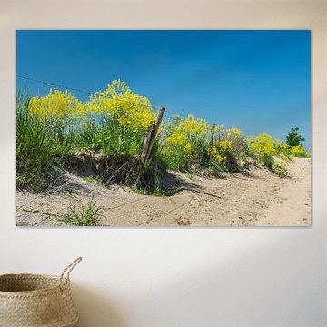 Herbes jaunes ou colza le long d'une clôture sur une dune
