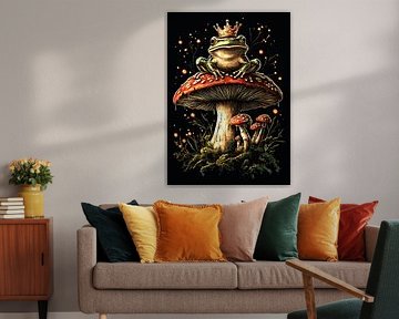 Un roi grenouille de conte de fées sur un champignon mouche