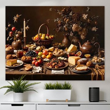 Table brune avec du pain, du fromage et des pommes - nature morte classique et chaleureuse