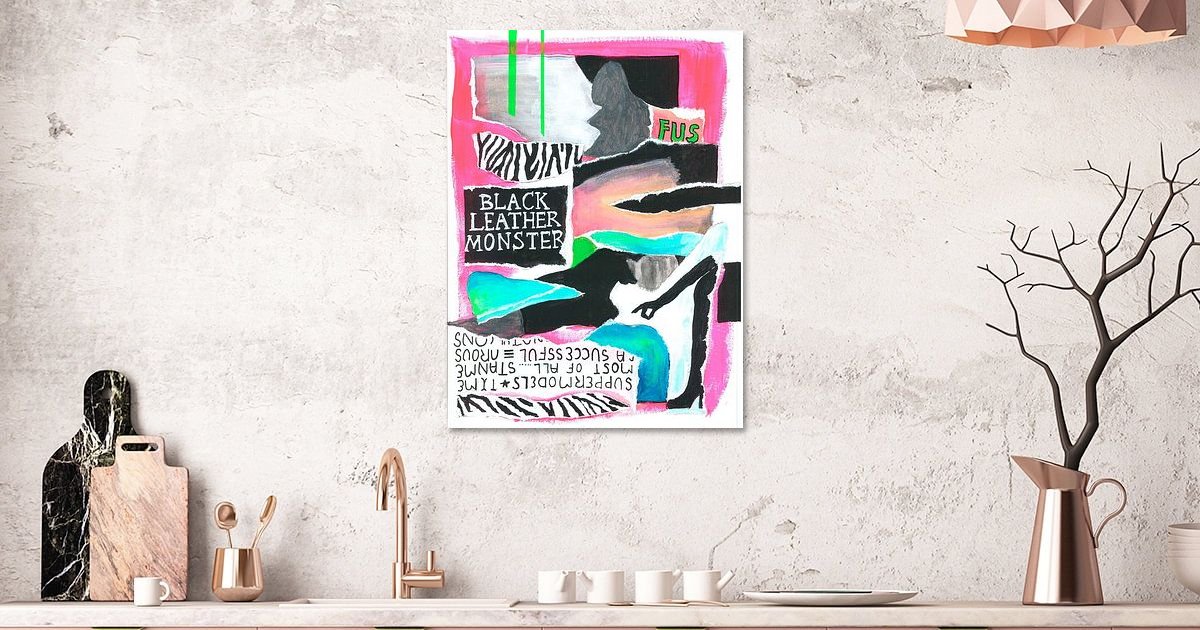 L'atmosphère de ses œuvres d'art peut être décrite comme des collages pop-art aux néons brillants et cultes, avec un côté nerveux et mystérieux.