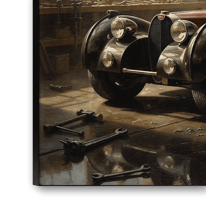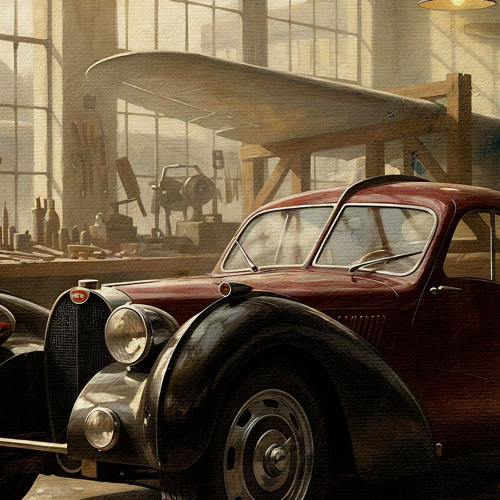 La lumière chaude et dorée qui traverse les fenêtres industrielles baigne la scène de nostalgie, tandis que les lampes suspendues au-dessus ajoutent une touche d'intimité. Il ne s'agit pas seulement d'un espace de travail, mais d'un sanctuaire de la créativité et du dévouement de l'homme. À travers cette peinture, j'ai voulu rendre hommage à la beauté intemporelle de la Bugatti et à l'héritage durable de ceux qui ont osé rêver et construire.