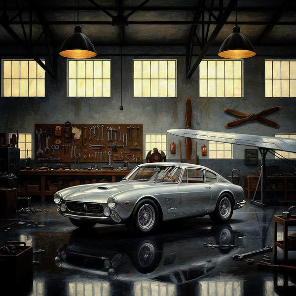 Cette peinture capture l'essence de l'élégance intemporelle et de l'art mécanique, vue à travers les yeux d'un artiste profondément inspiré par l'âge d'or du design. Au cœur de la composition se trouve une Ferrari 250GT Lusso de 1963, un chef-d'œuvre de l'ingénierie automobile, rendu avec une attention méticuleuse à ses courbes, ses reflets et ses détails emblématiques. La carrosserie argentée de la voiture brille sous l'éclairage industriel chaleureux, sa surface polie reflétant l'atelier qui l'entoure - un sanctuaire de l'artisanat.