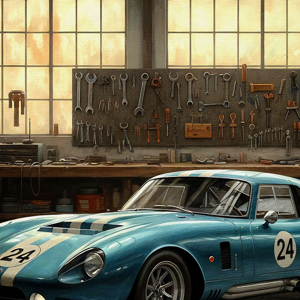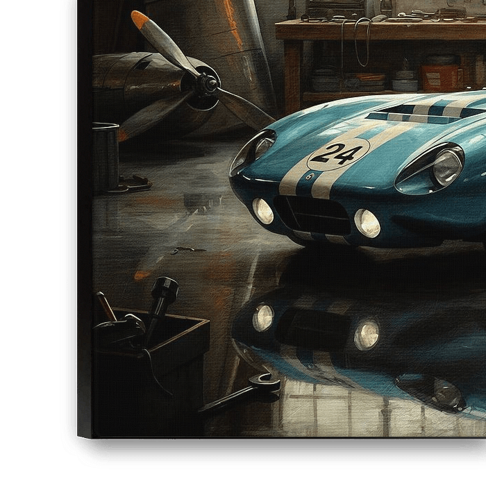La vision de l'artiste pour cette peinture capture l'essence de l'art mécanique et de l'artisanat intemporel. Au cœur de la composition se trouve une Shelby Daytona de 1965, symbole de vitesse et d'innovation, baignée dans une lumière chaude et dorée qui filtre à travers les fenêtres d'époque de l'atelier. La carrosserie bleu foncé de la voiture, ornée de bandes de course blanches et du numéro emblématique "24", dégage un sentiment d'histoire et de raison d'être, comme si elle renfermait d'innombrables histoires sur les circuits de course.