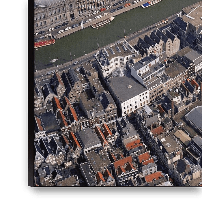 1987 : Vue aérienne historique du Munttoren sur la très fréquentée Muntplein où se rejoignent la rivière Amstel et le canal Singel dans le centre d'Amsterdam, Pays-Bas.