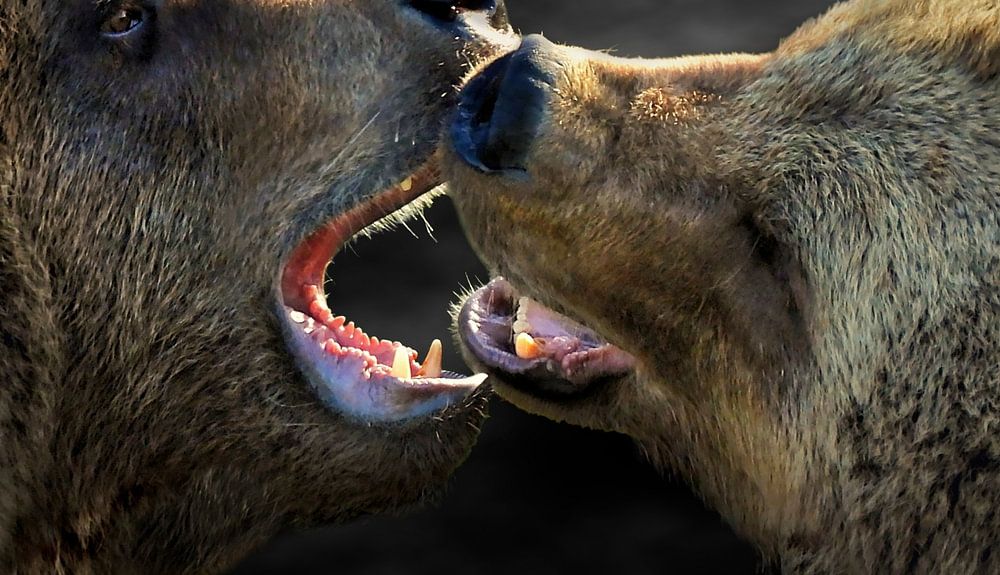 Portrait artistique de deux ours bruns en train de se battre sur un fond sombre.