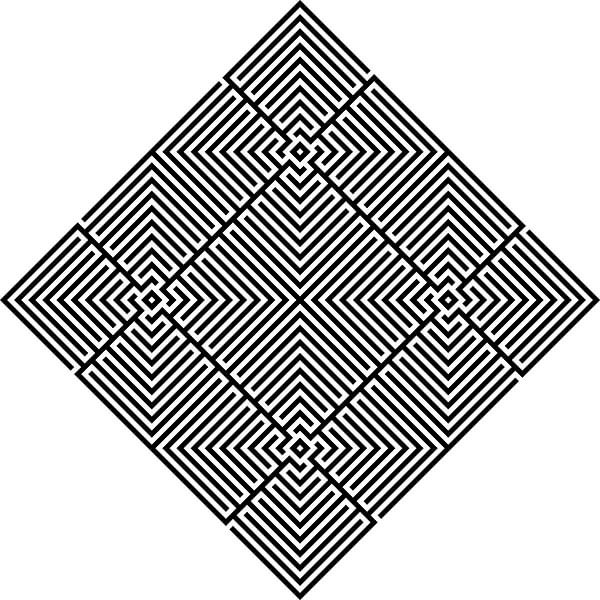 Bandes en forme de L. Disposition en matrice 2x2. Rotation de 45 degrés.