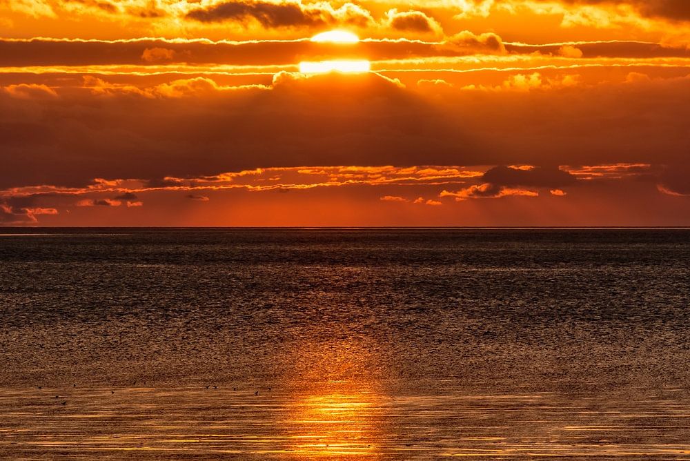 Coucher de soleil dans la mer des Wadden de Basse-Saxe. Au bord de la mer des Wadden à Cuxhaven, une vue à couper le souffle s'offre aux visiteurs de la réserve naturelle de la mer des Wadden d'Allemagne du Nord.