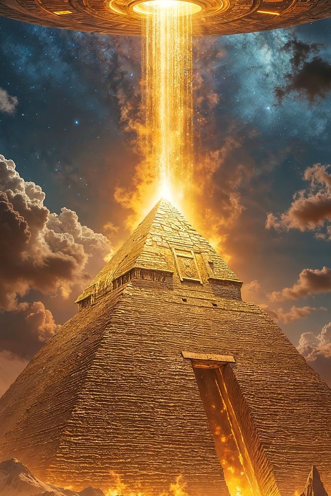 Dans le ciel nocturne s’ouvre une porte de feu et de lumière tandis qu’un OVNI colossal plane au-dessus d’une pyramide dorée. Un rayon d’énergie flamboyant relie le ciel et la terre, tandis que des figures antiques restent figées dans le sable du désert – témoins d’une rencontre au-delà du temps et de l’espace.