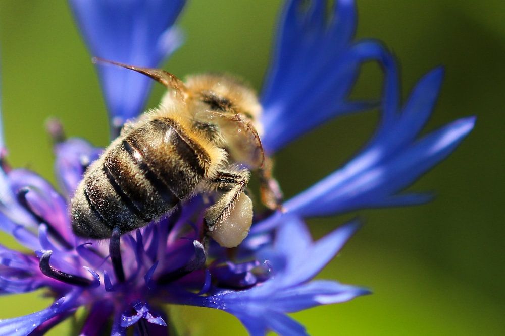 Gros plan d'une abeille sur une fleur de bleuet avec un bokeh vert foncé.