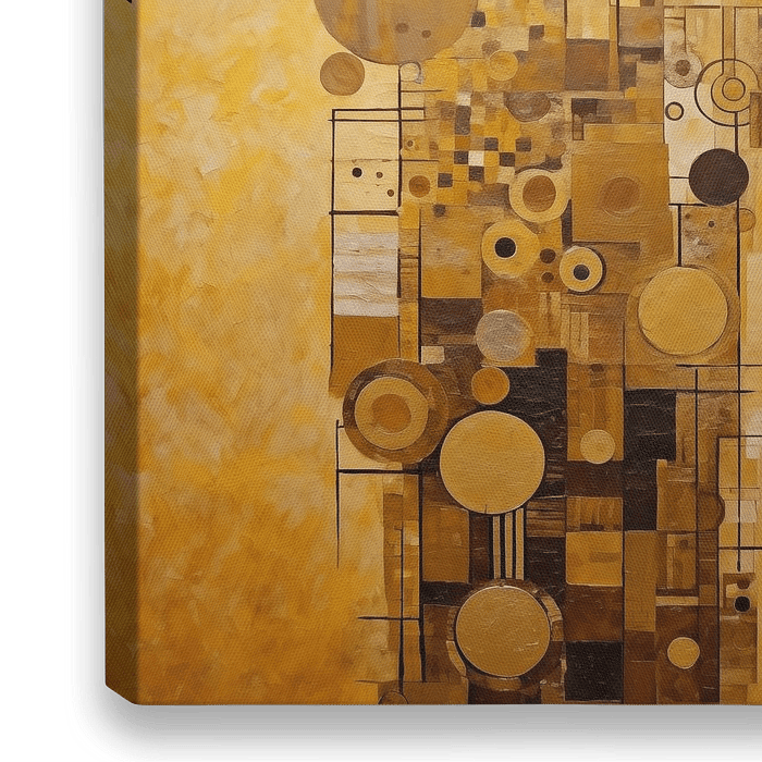 Art abstrait dans les tons marron et or avec un collage de cercles, de lignes et d'éléments cubistes sur une texture grossière.