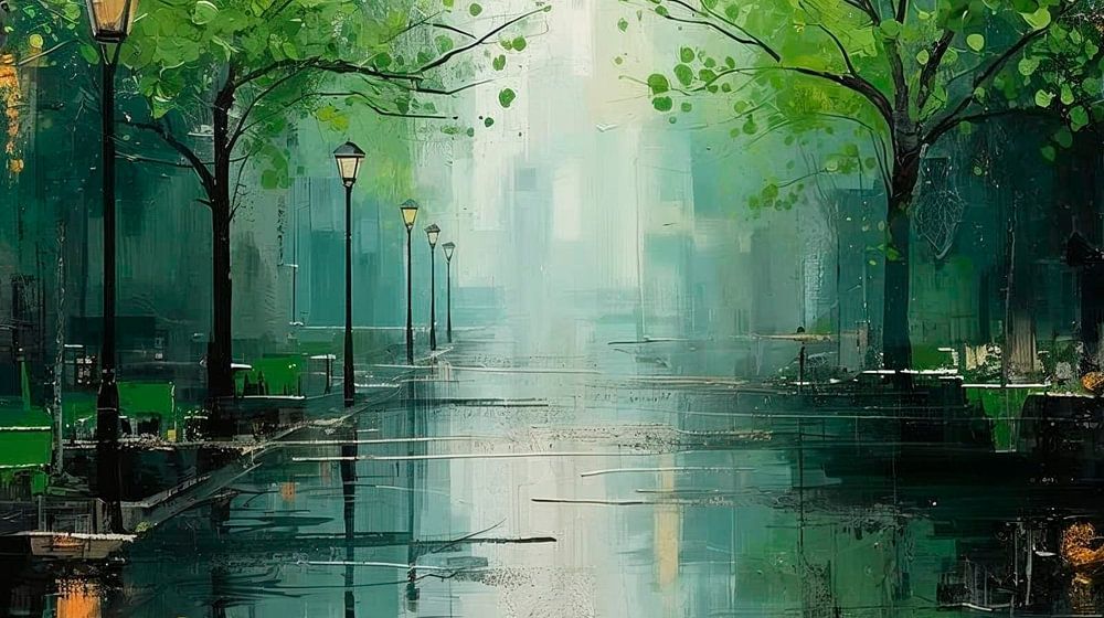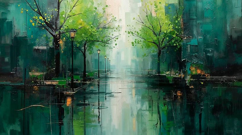 Cette peinture murale abstraite exclusive met en scène une scène de rue dotée d'une profondeur spatiale impressionnante, dans des tons anthracite, vert, noir et or. Les lignes marquantes guident le regard du spectateur vers le centre de l'image et confèrent à chaque pièce une ampleur architecturale. La combinaison de tons sombres et…