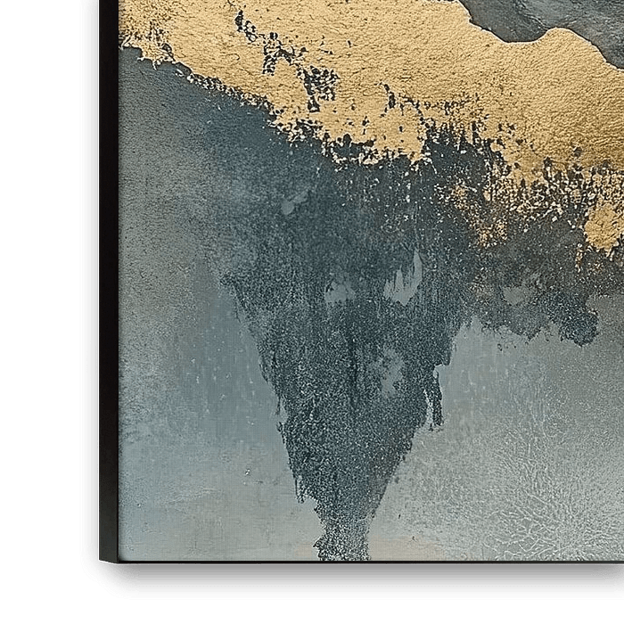 Détails : peinture abstraite, art de l'or, peinture de paysage, art moderne, couleurs bleues, atmosphère sereine, texture brillante, œuvre d'art, accents dorés, peinture bleue