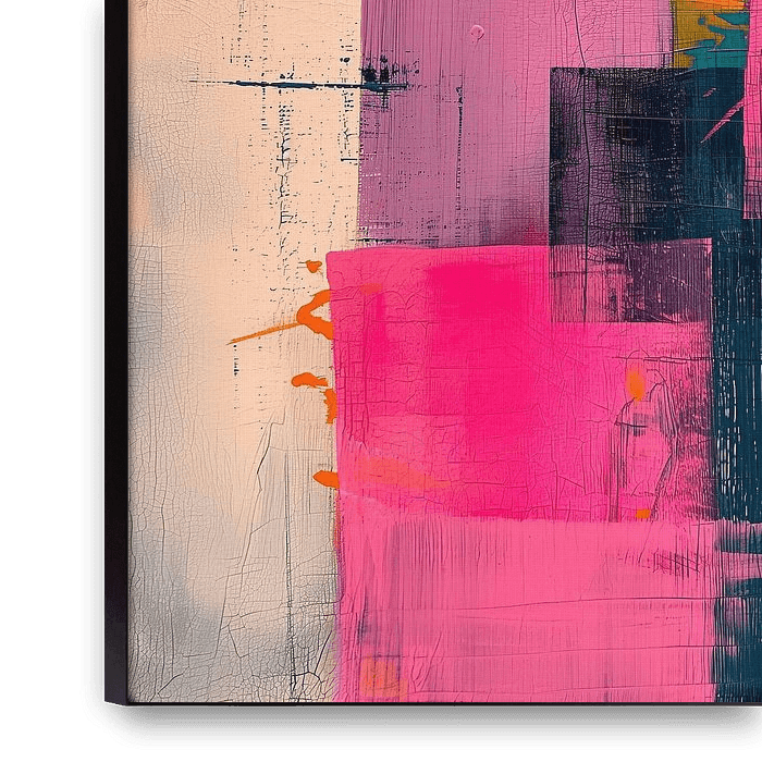 Une œuvre d'art abstraite minimaliste avec des blocs de peinture rose, orange et bleu-vert disposés dans une composition élégante. Les couleurs créent un sentiment de profondeur et de contraste, tandis que les coups de pinceau ajoutent de la texture. Cette œuvre d'art est parfaite pour ceux qui aiment l'art moderne qui évoque l'émotion…