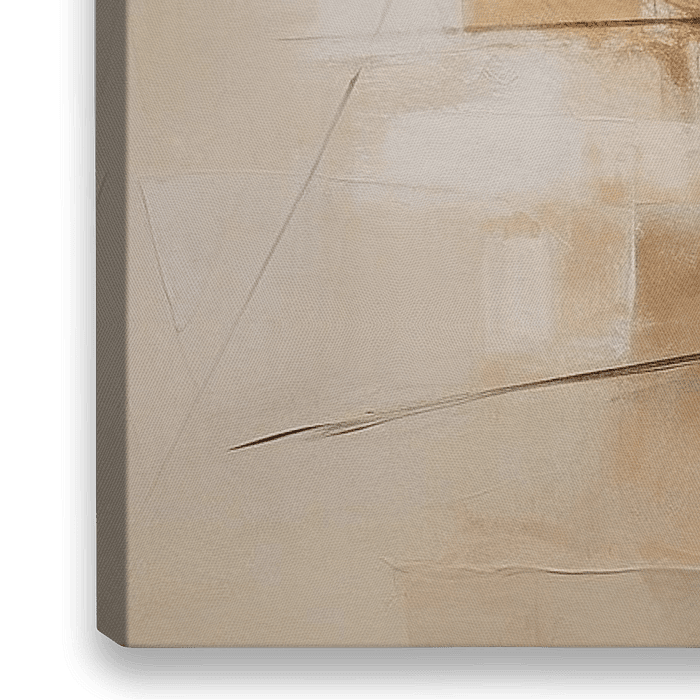 Abstraction terrestre - Le tableau présente une composition abstraite de formes géométriques et de lignes, exécutée dans une harmonie subtile de tons beige, crème et terre, rehaussés par des accents d'orange et de marron foncé. La texture stratifiée et les lignes entrecroisées contribuent à un aspect dynamique mais apaisant, idéal pour un intérieur contemporain ou minimaliste.