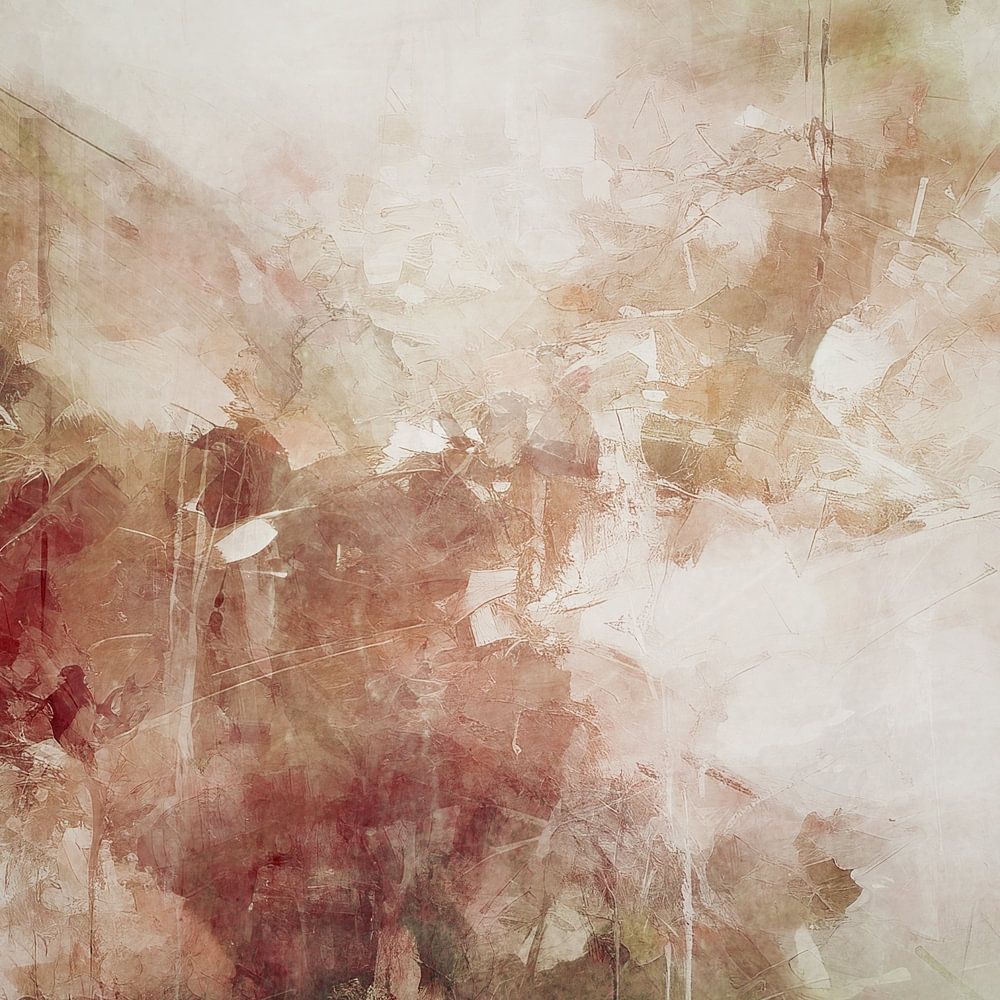 Cette œuvre moderne, dynamique et abstraite - qui fait partie d'une série de trois - est peinte dans des tons de vert, de brun et de rouge terreux ainsi que de blanc.