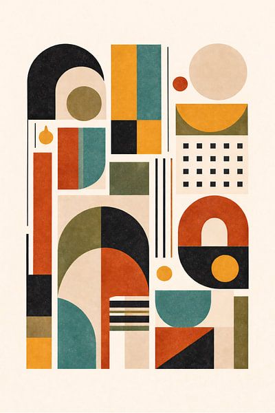 Une abstraction géométrique moderne inspirée des principes du design Bauhaus. Des formes audacieuses, des lignes épurées et des tons terreux créent une composition équilibrée à la fois rétro et contemporaine. Parfaite pour les intérieurs minimalistes, les studios créatifs et les espaces de vie modernes.