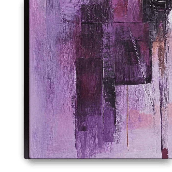Abstrait contraste violet - Cette peinture abstraite présente une composition dynamique de plans et de lignes violets et orange sur un fond à dominante violette, évoquant la sensation de mouvement et de profondeur par le contraste des couleurs et des textures.
