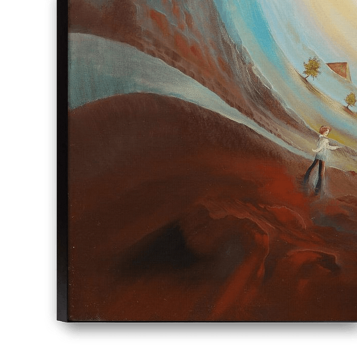 La peinture surréaliste actuelle présente un monde fascinant rempli d'informations précieuses sur des éléments surréalistes et oniriques qui transportent l'observateur dans une réalité éthérée. Au centre de la composition se trouve un trou lumineux et frappant au bout d’un tunnel apparent. Cette illumination intense dans le ciel semble représenter la fin d’une grotte sombre, un passage symbolique de l’obscurité à la lumière. Des faisceaux de lumière rayonnent dans différentes directions à l’intérieur du cercle.