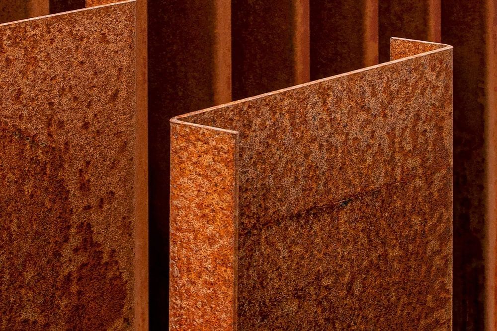 Une architecture moderne, où l'acier Corten industriel se mêle à une architecture moderne composée de blocs blancs.