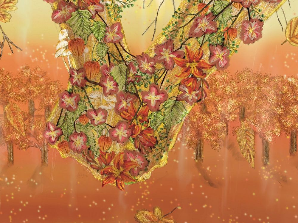 Des fleurs et des feuilles forment deux personnages qui se tiennent tendrement l'un l'autre dans la lumière dorée de l'automne. Cette peinture à l'huile numérique, "Autumn's Amber Affection", capture un moment chaleureux et intime de connexion et de sécurité, où la saison et la proximité se rejoignent.