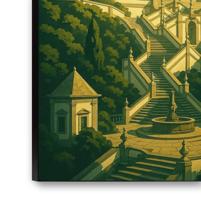 Cette affiche de Braga capture la grandeur du sanctuaire Bom Jesus do Monte dans un style Art déco plein de lumière et de symbolisme. Le célèbre escalier baroque conduit le regard vers le sanctuaire illuminé, encadré par des rayons de soleil qui confèrent à la scène une atmosphère majestueuse, presque divine. Conçu avec des lignes épurées, des tons dorés et une esthétique de poster de voyage vintage, cet art mural de Braga est idéal pour les passionnés d'histoire, d'architecture et du charme intemporel du Portugal. Il s'agit d'une œuvre d'art puissante pour les intérieurs, qu'elle soit accrochée dans un salon, un couloir ou un studio de création. La combinaison de symétrie et d'élégance reflète le rôle de Braga en tant que "Rome du Portugal", une ville d'une grande importance religieuse et culturelle. Parfaite pour les voyageurs, les admirateurs de l'architecture sacrée ou les collectionneurs d'œuvres d'art rétro, cette affiche transforme le sanctuaire emblématique de Braga en une pièce décorative audacieuse à l'attrait universel.