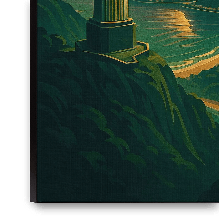 Cette affiche Art déco brésilienne respire l'allure tropicale de Rio de Janeiro, avec l'imposante statue du Christ Rédempteur surplombant le Pain de Sucre et la baie de Guanabara. Le coucher de soleil irradie la lumière dorée à travers des violets et des verts doux, mêlant la foi, le paysage et l'art dans un rythme parfait.