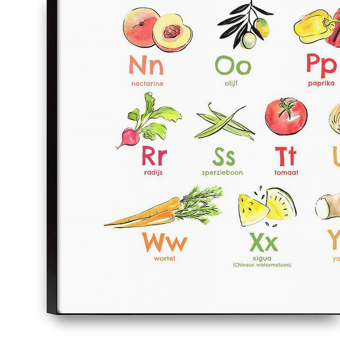 Alphabet éducatif et culinaire des fruits et légumes, de la pomme à la patate douce. Il est agréable dans un restaurant, une cuisine ou une chambre d'enfant. Réalisé avec des illustrations à l'aquarelle de la nourriture.