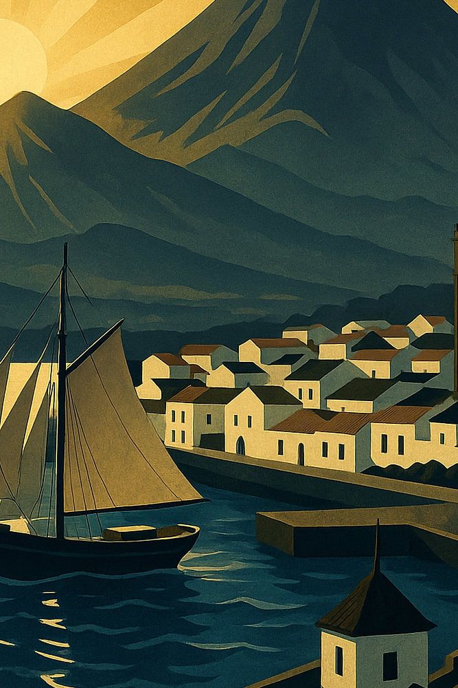 Cette affiche de Ponta Delgada illustre la beauté de la plus grande ville des Açores dans un style Art déco époustouflant. La composition montre un voilier glissant sur les eaux calmes de l'Atlantique, avec l'emblématique tour de l'horloge s'élevant au-dessus de la ville. À l'arrière-plan, la silhouette spectaculaire du mont Pico domine l'horizon, baigné par les rayons dorés du coucher de soleil. Capitale de l'île de São Miguel, Ponta Delgada allie paysages volcaniques, patrimoine maritime et charme portugais. Cette œuvre d'art capture cette atmosphère unique, mêlant majesté naturelle et élégance architecturale. Parfait pour les amoureux de l'océan, les rêveurs d'îles et les passionnés de voyages, cet art mural de Ponta Delgada apporte la sérénité et l'aventure des Açores dans votre maison. Avec ses tons riches et son inspiration de voyage vintage, il s'agit d'une pièce à la fois décorative et inspirante pour n'importe quel intérieur.