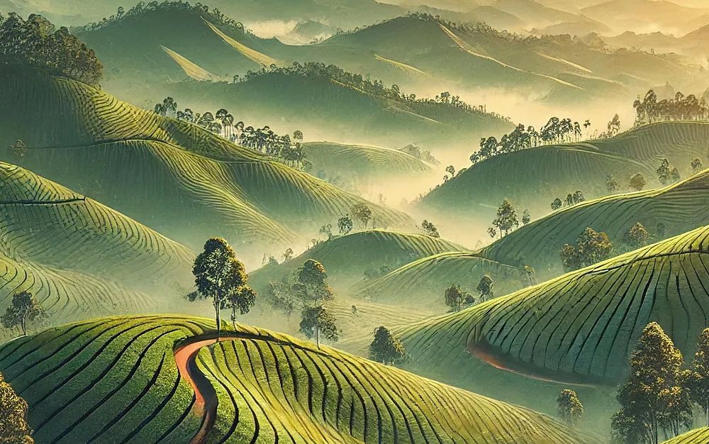 Des terrasses verdoyantes balaient les courbes des collines tandis que d'étroits sentiers pédestres relient les pentes entre elles. La brume matinale repose dans les plis de la vallée et le premier soleil réchauffe le sommet des buissons, de sorte que les rangées se lisent comme de douces rayures. Regardez de près et vous verrez de petits sentiers de cueilleurs entre les haies, des marches en pierre dans un virage et le toit d'un petit hangar qui capte la lumière près d'une crête. La composition reste ouverte et claire, de sorte que le rythme des rangées, des chemins et des collines guide l'œil sans bruit.