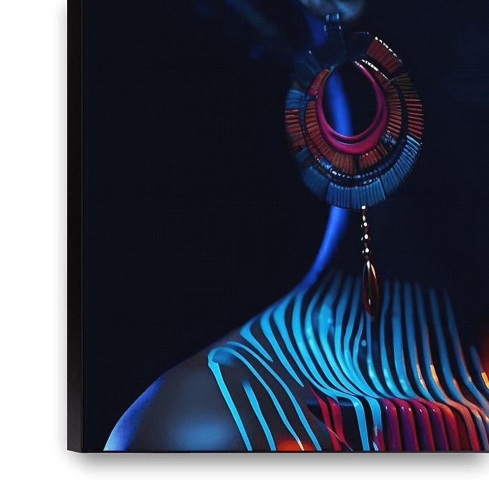 Een intrigerend portret van een Afrikaanse vrouw springt naar voren tegen een zwarte achtergrond, overgoten met neon verlichte tinten. Haar gelaatstrekken worden subtiel verlicht door het fluorescerende licht, wat een futuristisch en mystiek effect creëert. De felgekleurde accenten benadrukken haar charisma en individualiteit, terwijl…