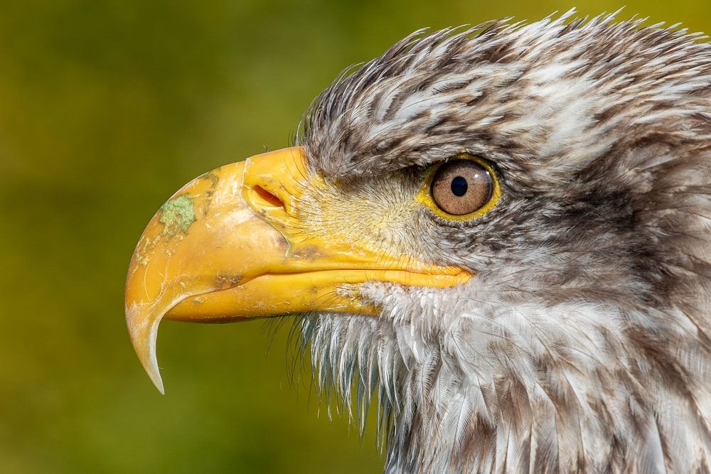 Le pygargue à tête blanche est un grand oiseau doté d'un bec crochu jaune et puissant. Il se distingue par sa tête blanche, d'où son nom américain Bald Eagle (aigle chauve). Ce n'est qu'au bout de sept ans que l'oiseau est entièrement coloré et qu'il devient brun avec la tête et la queue blanches. Le pygargue à tête blanche sur la photo est âgé d'environ 4 ans.