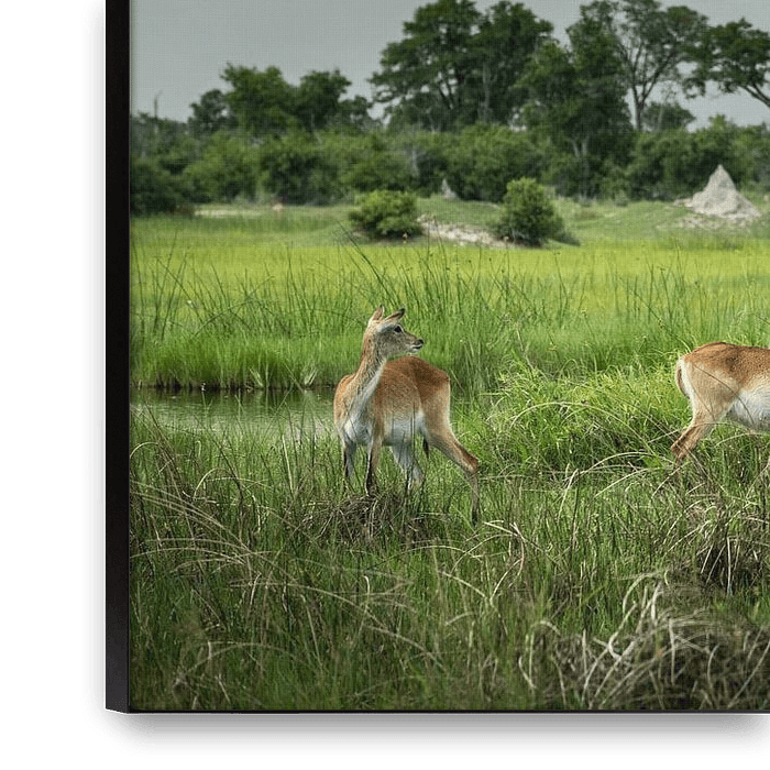 Achetez cette œuvre d'art de paysage Aigle pêcheur africain et lechwe rouge dans la réserve de Moremi par Paula Romein sur toile, aluminium, ArtFrame ou photographie (encadrée), impression d'art en haute qualité et tout format.