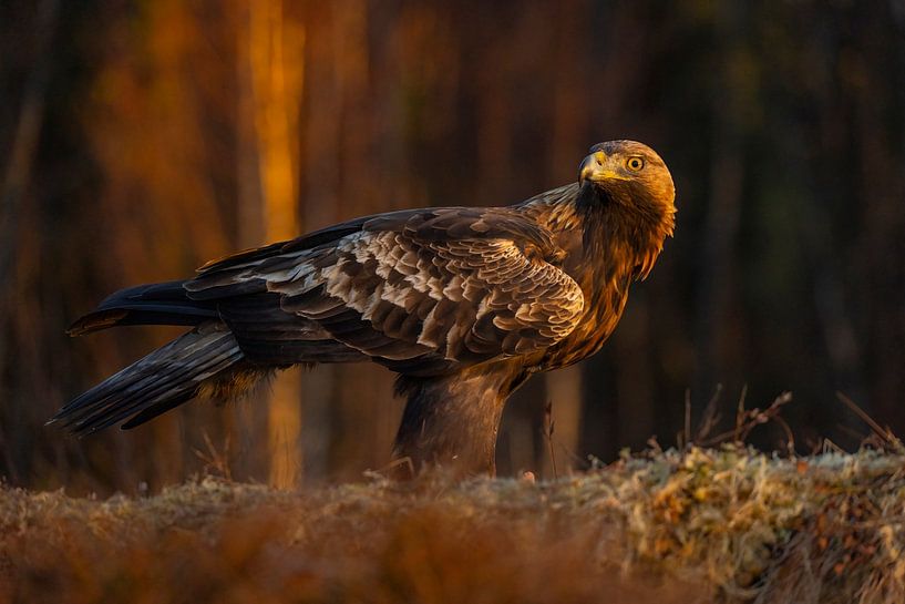 L'espèce est protégée dans de nombreux pays ; elle était autrefois persécutée en raison des dommages qu'elle causait au bétail. Grâce à des mesures de conservation et à des projets de réintroduction, la population se reconstitue lentement dans certaines régions d'Europe. L'aigle royal est considéré comme un symbole de force, de liberté et de nature sauvage. La photo a été prise dans le nord de la Suède à l'heure dorée.