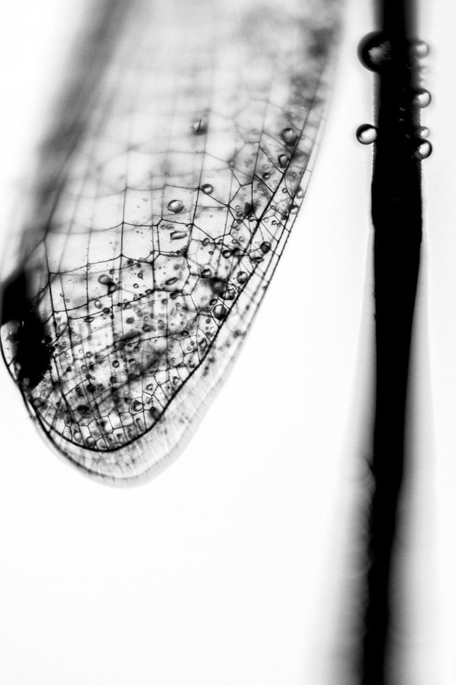 Ailes d'une libellule avec des gouttes de rosée. Photo en noir et blanc.
