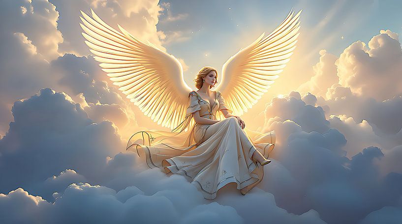 Un magnifique ange aux ailes gracieusement arrondies est délicatement assis sur un nuage blanc et duveteux. Ses ailes sont majestueuses et scintillent dans la lumière alors qu'elles décorent le ciel. L'ange porte une étonnante robe flottante en tissu chatoyant qui reflète les couleurs du coucher de soleil - des roses doux, de l'or et…