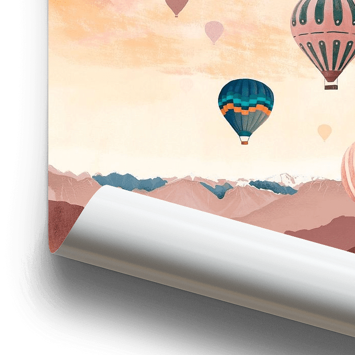Une illustration dans laquelle on peut se perdre ! Un paysage montagneux se détachant sur un ciel aux couleurs d'un soleil couchant. De nombreux ballons aux couleurs magnifiques flottent dans l'image. Que l'aventure commence !