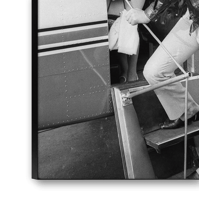 À l'aéroport de Nice, Alain Delon et Romy Schneider prennent l'avion pour se rendre à Saint-Tropez pour le tournage du film LaPiscine