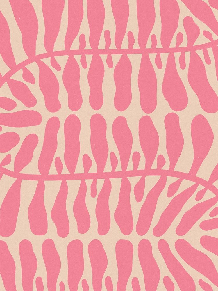 L'image présente un design abstrait inspiré des plantes, d'un rose vif sur un fond beige. Il ressemble à une liane ou à une tige stylisée et courbée qui serpente horizontalement sur l'image, créant un motif répétitif et ondulé. De chaque côté de cette ligne centrale s'étendent des formes symétriques, semblables à des feuilles, qui rappellent des formations allongées en forme de gouttes et donnent l'impression d'une plante aux nombreuses feuilles. L'œuvre d'art a un aspect simple mais dynamique et organique qui souligne la répétition et le flux avec une esthétique minimaliste et moderne.
