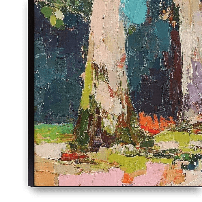 Cette peinture impressionniste montre un vaste sentier bordé d'arbres qui mène au loin. Le chemin est peint dans des tons clairs de beige et de crème, avec des coups de pinceau visibles qui créent une texture naturelle. Les arbres hauts et élancés sont peints dans de délicates nuances de beige, de gris et de blanc, leur feuillage dans…