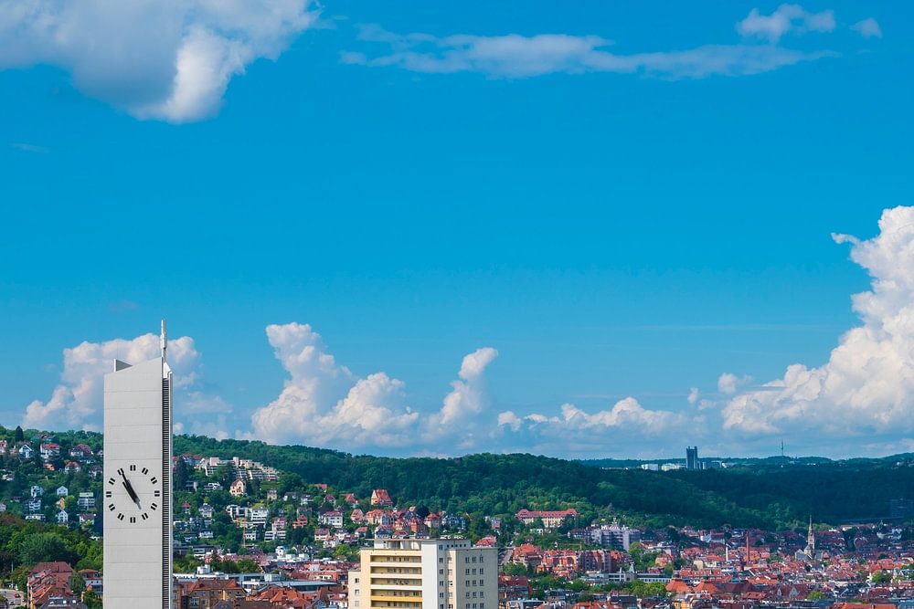 A propos de "Allemagne, vue aérienne panoramique au-dessus des maisons et de l'église de la ville de Stuttgart, l"