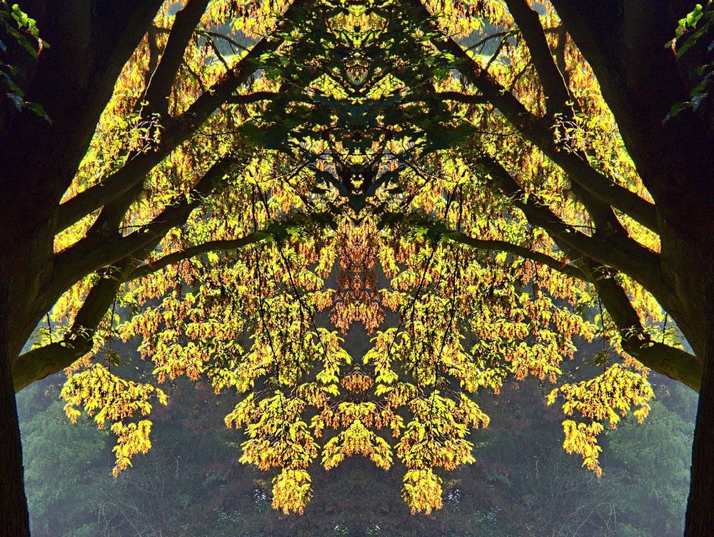 Reflet d'un arbre d'automne avec une promeneuse dans un parc