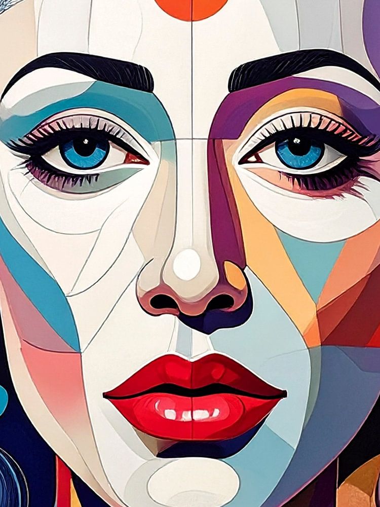 Cette représentation d'Allegra est un exemple fascinant de cubisme moderne, qui allie profondeur émotionnelle et abstraction géométrique. La représentation de la femme est divisée en différents plans colorés qui ressemblent aux facettes d'un diamant. Cette fragmentation du visage ne reflète pas une déchirure intérieure, mais crée une personnalité dynamique et complexe. Les yeux sont le point d'ancrage émotionnellement fort. Ils sont représentés de manière détaillée et réaliste dans un environnement abstrait. Les yeux bleus regardent directement le spectateur et transmettent un mélange d'intensité et de réflexion. Ils semblent vivants, presque comme s'ils racontaient une histoire sans avoir besoin d'un seul mot. Les lèvres rouges et la peinture orange sur le front confèrent en outre à l'image un rayonnement puissant, presque mystique. Les tons chauds d'une moitié du visage contrastent avec les nuances froides et bleues de l'autre, ce qui pourrait symboliser la complexité et la dualité de la nature humaine. Ce portrait est un hommage à la force et à la complexité de la femme moderne, qui ne peut être réduite à une seule facette. Il s'en dégage une force tranquille qui fascine le spectateur.