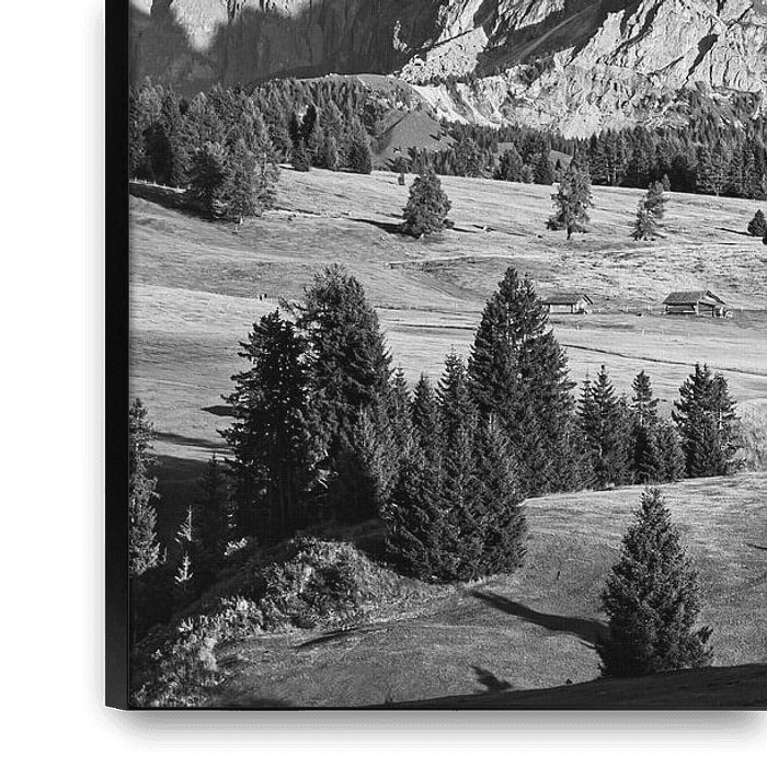 Photo en noir et blanc de l'Alpe di Siusi (en allemand : Seiser Alm), un plateau des Dolomites et le plus grand alpage de haute altitude d'Europe.
