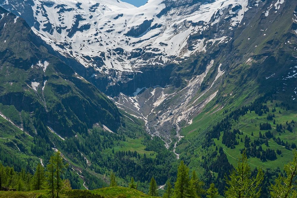 Vue sur la vallée de Fuscher en direction des Fuscherkarkopfs, de la montagne Hohe Dock et du col de Fuscher Törl dans la province de Salzbourg, en Autriche, au cours d'une belle journée de printemps.