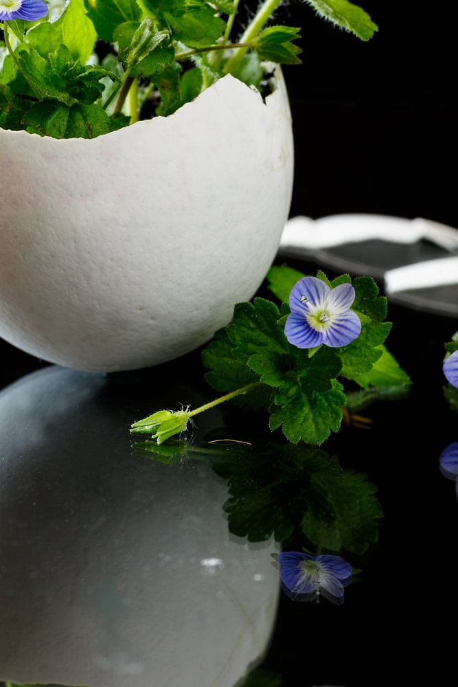 Aus einem aufgeschlagenen Ei wachsen Vergissmeinnicht. Ein Symbol für neues Leben.