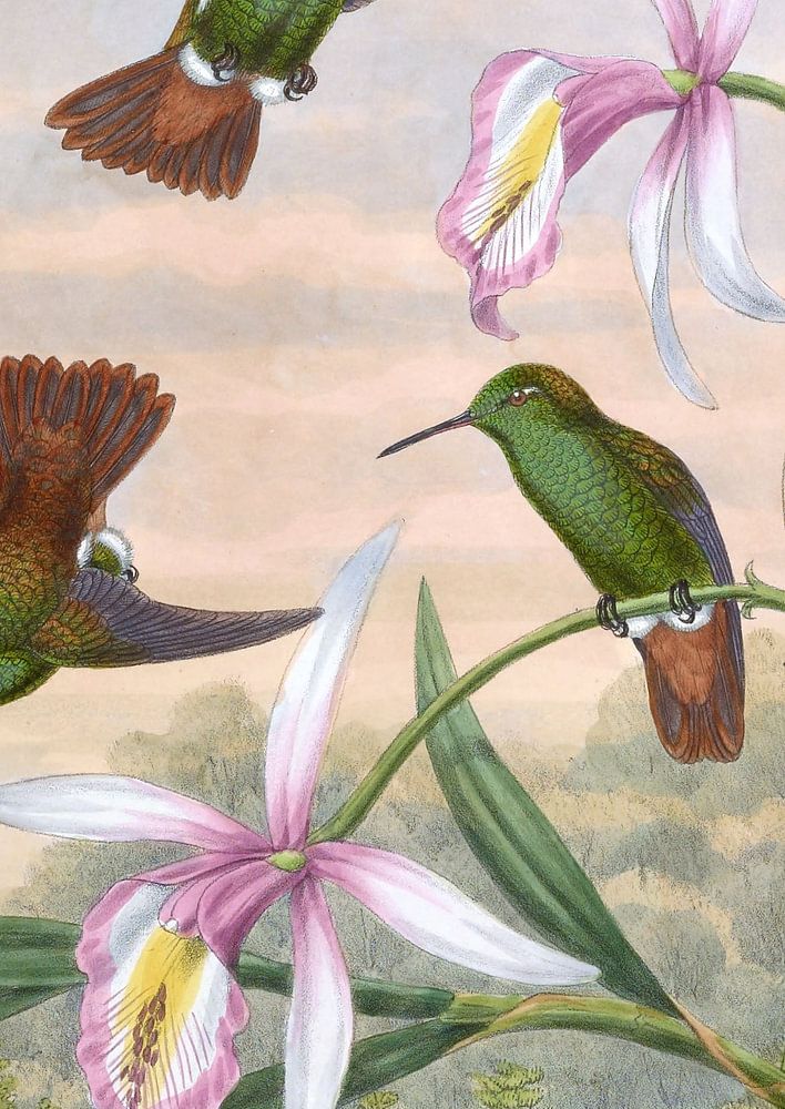 Amazili à la queue en cuivre (Amazilia Cupreicauda), John Gould MH Whitely a découvert les espèces actuelles en Guiane britannique, l'ayant rencontré sur Roraima et sur les montagnes Merumé. Cette illustration a été restaurée à son dynamisme d'origine en améliorant les couleurs et en supprimant les marques indésirables. Une monographie des trochilidæ, ou famille de birds de colibris, a été publiée entre 1849 et 1887 par l'ornithologiste anglais John Gould. Ce travail monumental dépeint et décrit toutes les espèces connues de colibris à l'époque - comprenant 418 plaques lithographiques et des informations sur 537 espèces. "