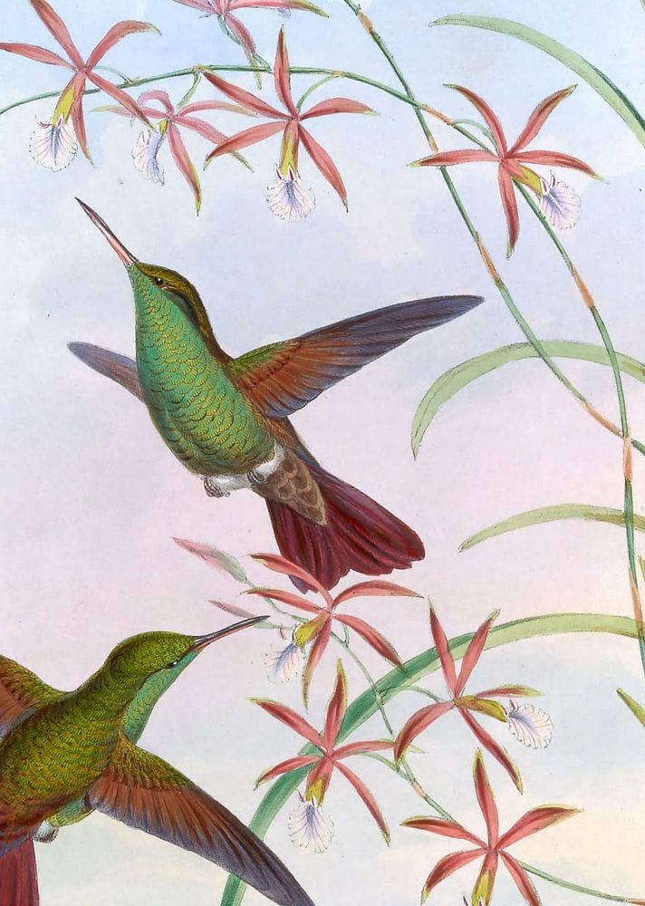 Deville's Amatili (Amazilia Devillei), John Gould Afin d'effectuer une détermination correcte de nombreuses espèces de ce groupe d'oiseaux, j'ai trouvé absolument nécessaire d'examiner les spécimens typiques à partir desquels les descriptions originales ont été prises, une tâche sans difficulté ordinaire, distribuée comme elles sont parmi les nôtres et les musées continentaux, publics et privés. Cette illustration a été restaurée à son dynamisme d'origine en améliorant les couleurs et en supprimant les marques indésirables. Une monographie des trochilidæ, ou famille de birds de colibris, a été publiée entre 1849 et 1887 par l'ornithologiste anglais John Gould. Ce travail monumental dépeint et décrit toutes les espèces connues de colibris à l'époque - comprenant 418 plaques lithographiques et des informations sur 537 espèces. "