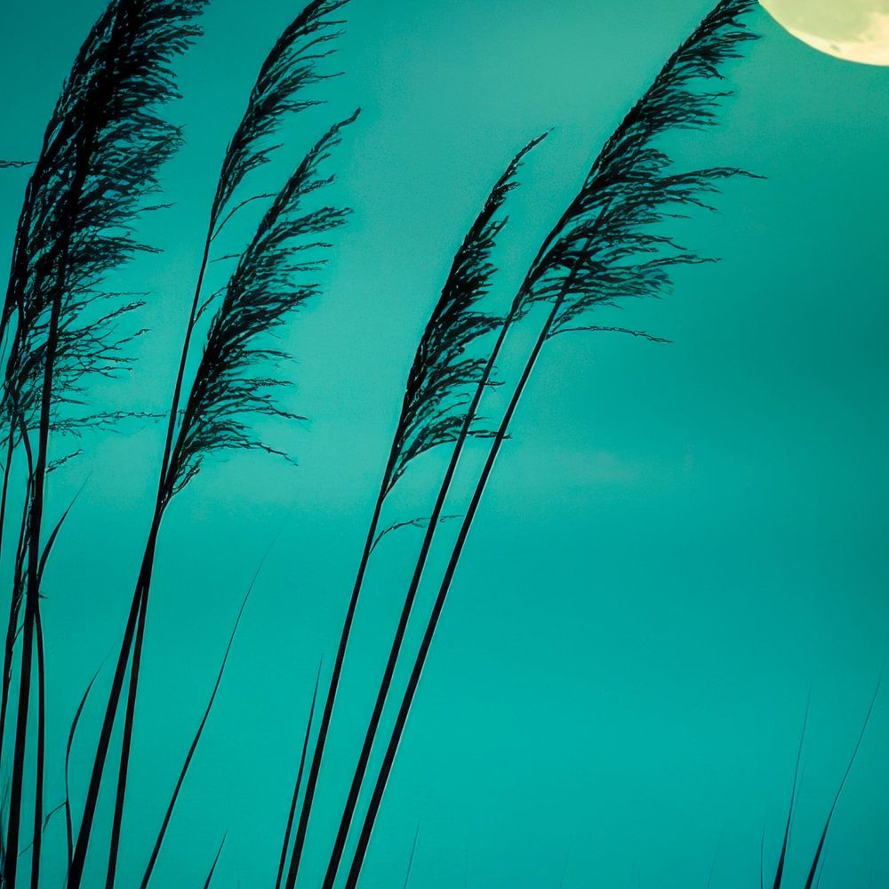 Un ciel nocturne mystique se déploie, éclairé par une lune lumineuse qui, tel un œil scintillant, veille sur les douces ondulations des herbes. Ses silhouettes étroites dansent dans le vent doux, créant un lien harmonieux entre la terre et le ciel, tandis que l'atmosphère bleue et fraîche évoque un sentiment de calme et de mystère.