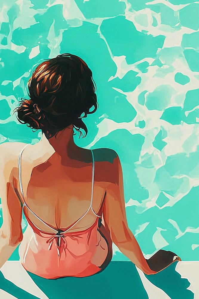 Une illustration numérique aux tons chauds et froids représente une femme en maillot de bain rose se relaxant au bord d'une piscine turquoise. Le jeu de lumière et de reflets dans l'eau crée un effet onirique, presque méditatif. La composition respire la tranquillité et la détente estivale, avec une approche artistique moderne rappelant les affiches de voyage rétro.