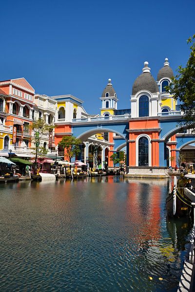 Cette image illustre l’un des canaux emblématiques du complexe Grand World à Phu Quoc, au Vietnam, un lieu conçu comme une destination touristique immersive mêlant architecture, loisirs et culture. Bordé de façades aux couleurs vives et harmonieuses, le canal évoque une atmosphère inspirée des villes européennes, notamment de Venise, tout en conservant une identité propre et contemporaine. Les bâtiments symétriques, aux lignes élégantes et aux détails soignés, encadrent l’eau calme qui reflète les teintes pastel et le bleu intense du ciel tropical. Les terrasses, les balustrades et les arbres soigneusement disposés renforcent l’impression d’un espace vivant, pensé pour la promenade et la détente. L’arche monumentale au fond du canal agit comme un point focal visuel, structurant la composition et guidant naturellement le regard. Sous la lumière éclatante, l’ensemble dégage une sensation de sérénité et de propreté, caractéristique des lieux touristiques modernes. Grand World Phu Quoc se présente ainsi comme une vitrine du tourisme contemporain vietnamien, où le décor architectural devient une expérience à part entière. Ce paysage urbain artificiel, mais soigneusement élaboré, attire visiteurs et photographes en quête de scènes pittoresques, offrant un cadre idéal pour la flânerie, la découverte et le divertissement au cœur de l’île de Phu Quoc.